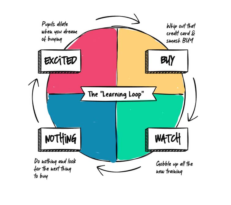 I was talking to a friend earlier this week who felt stuck. "What's holding you back?" I asked. "I feel like I'm stuck in a 'learning loop'," she admitted. She bought all the courses but hadn't implemented what she was learning. She had a head full of knowledge but a blank page in front of her. I know how she feels because I've been there. In fact, I've been in and out of Learning Loops for a long time. I hoarded courses, memberships, training, and software for years. Not fun. Here's what it looks like, starting at the top left: The way to defeat that monster is to bash it on the head with a heavy dose of implementation. No time to learn something new if you're busy getting results and publishing your art into the world. Here's the truth. You already know what you need to know. So let's get to implementing this week. Publish that landing page, ad, podcast, or video. Send an email, create a reel, or make an offer to someone. It's time. (And if you need my help implementing, I just opened up my March calendar to help 3 people implement something big this week. Reply back if you'd like the details of an Implementation Session together so we can turn your "to-do" list into a "done" list). You got this. ~ Cody "Implementation over Ideas" Burch |