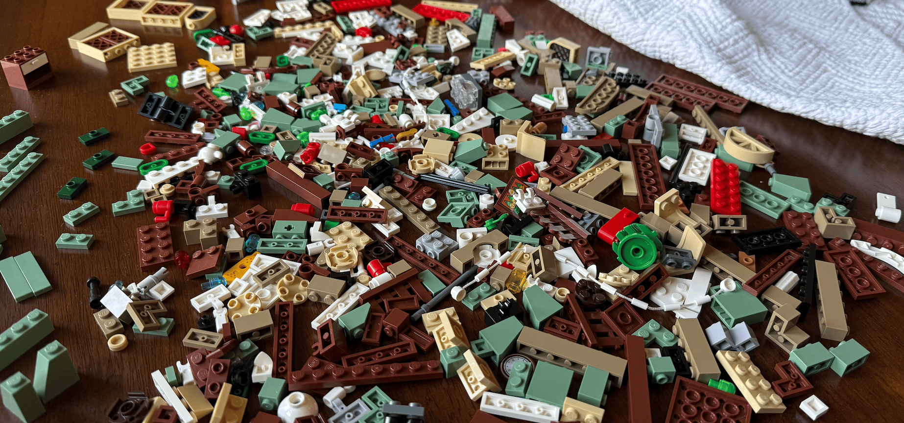I need your help. I'm trying to find a dark green, 4x1, smooth brick in this pile 👇 Let me know if you see it. Here's the situation: It's a Saturday in December, which means my kids and I are (re)assembling our Christmas LEGO sets. This pile of bricks will eventually become an Elf Club House (complete with a waffle machine and a gift-wrapping station). We got this set a few years ago, so it's not in the original numbered bags. Whoever disassembled it last year just put all the pieces into one...